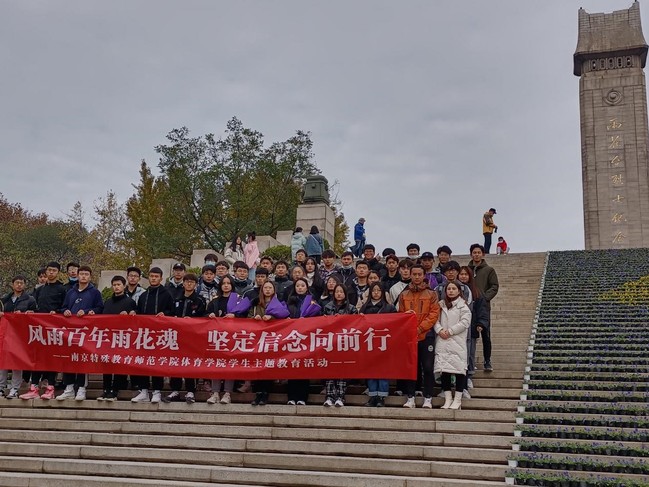 而后,老师和同学们手持菊花,在雨花台烈士纪念碑前凭吊先烈。学生代表王越和温凯璇在纪念碑前演讲,表达自己对革命先烈的敬畏之情。江子健同学带领同学们进行庄严宣誓,表达自己奉献国家的决心。在教师发言中赵伟健老师指出,革命先烈为了国家民族牺牲的无私、大无畏精神是值得我们学习的。作为一个体育人,我们必须要有坚定的信念和团结的精神,坚定跟党走,团结一心推动天游ty8线路1线路2检测中心做大做强。努尔老师也表示,我们现在所处的是一个和平的年代,都是那些先烈的功劳。我们要严格要求自己,用自己的行动去报效祖国。随后,带队老师和同学们前往烈士就义群雕前进行瞻仰。师生们在“风雨百年雨花魂,坚定信念向前行”的横幅上集体签名,表达自己的爱国情怀和对国家美好的祝愿。