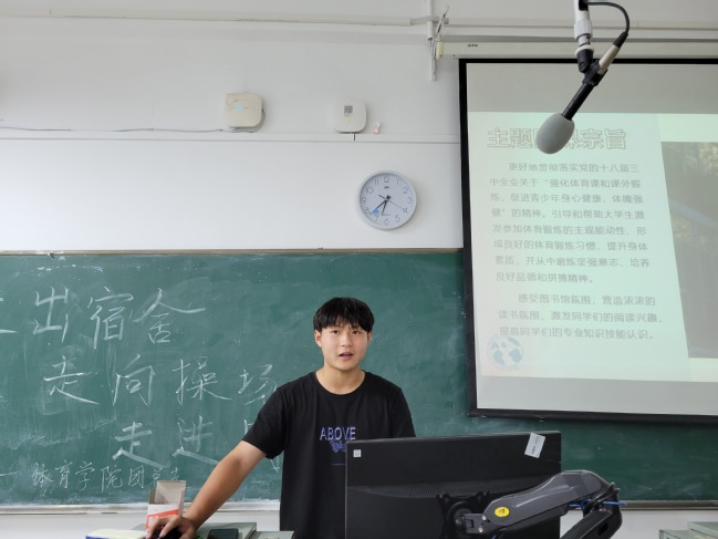 紧接着,体育1901班包涵硕围绕“走出宿舍、走向操场、走进图书馆”行动的概念、意义与具体做法进行阐述,并指出强健民族体魄、振奋民族精神、提升民族素质是体育人的使命,自力更生、攻坚克难是体育人的奋斗路径。作为在座的每一位体育人,应自觉树立健康第一的理念,落实“三走”行动,带动更多周边同学在体育锻炼中享受乐趣、增强体质、健全人格、锤炼意志。