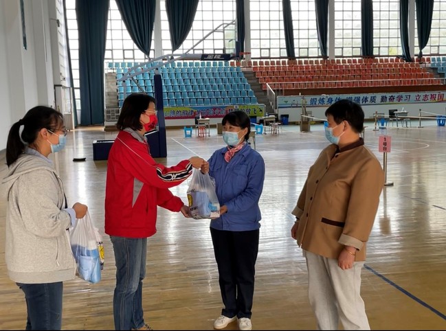 特殊时期,每日全员核酸检测在体育馆进行,连日来场馆保洁人员早起晚睡,布置核酸检测场地,核酸检测结束后再对场馆进行清洁和消杀,为留校师生提供安全、卫生、整洁的运动场馆。金梅副院长来到保洁人员值班室,为她们送上抗疫物资慰问品,对她们的付出与辛劳表示衷心感谢。