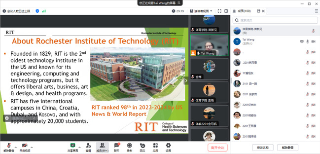 讲座伊始,王永泰教授对罗彻斯特理工大学系统进行了全面介绍,特别强调了该校的美国国家聋人学院。接着,他详细阐述了美国运动损伤的诊断和处理方法,并分享了未来的康复前景。同时,王教授还深入介绍了自己正在从事的虚拟仿真技术结合轮椅运动训练的课题研究。