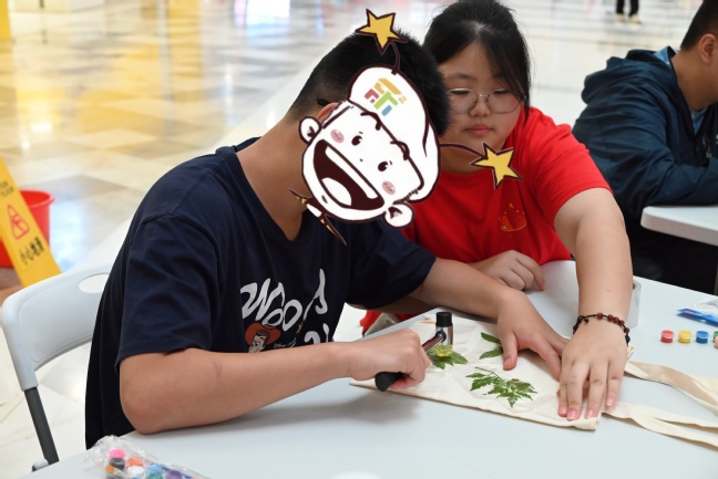 撷一叶流彩,拓自然之语。植物拓印,是一项古老的艺术,承载着人们对自然的敬畏与热爱。志愿者们向特殊儿童介绍了植物拓印技艺的悠久历史和发展创新,以及植物拓印的手工制作方法,同时带领他们通过固色、布局、敲打,将花草的汁液拓印在纸上,留下大自然的香气、纹理、色彩,最后用来装饰自己的小布包。参加活动的小朋友发挥了自己的创意巧思和想象力,认真创作,在一个多小时的时间里,收获独属于自己的作品。