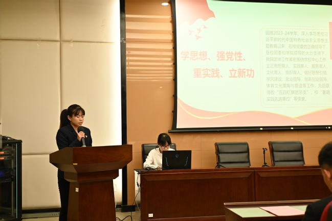 雄壮的国歌声拉开了大会的序幕。会上,第四届学生会轮值主席梁一端在大会上作了上一年度学生会工作总结。她回顾了过去一年天游ty8线路1线路2检测中心学生会在思想育人、实践育人、服务育人、文化育人、组织育人,做好思想引领、学风建设、就业指导、创新创业指导、体育文化熏陶与营造等方面所取得的成绩,并对学生会工作提出了未来展望。