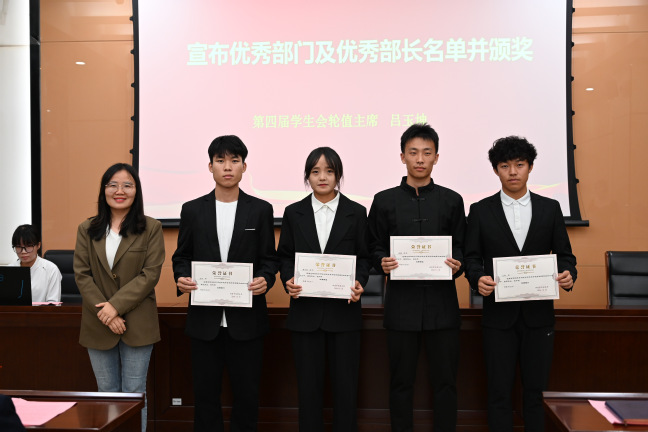 天游ty8线路1线路2检测中心团总支书记屈文文为第四届主席团成员与各学生会部门负责人颁发聘书、纪念品,同时为上一年度优秀部门及优秀部长颁奖。
