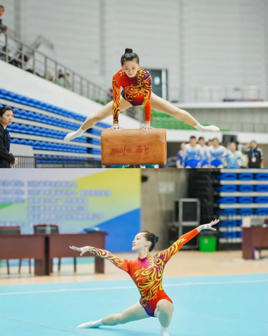 在女子全能的角逐中,秦玥同学以一套融合传统武术元素的自由操脱颖而出。她身着水墨纹饰体操服,将太极拳的刚柔并济与竞技体操的腾跃技巧巧妙结合,最终站上自由操单项季军领奖台,同时斩获女子全能第三名的好成绩。